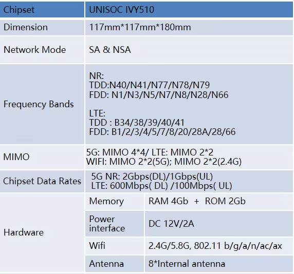 | 5G | N41/N78/N79 | 2.4G+5G dual-band WIFI hotspot ( AP) | Suitable for home or commercial |