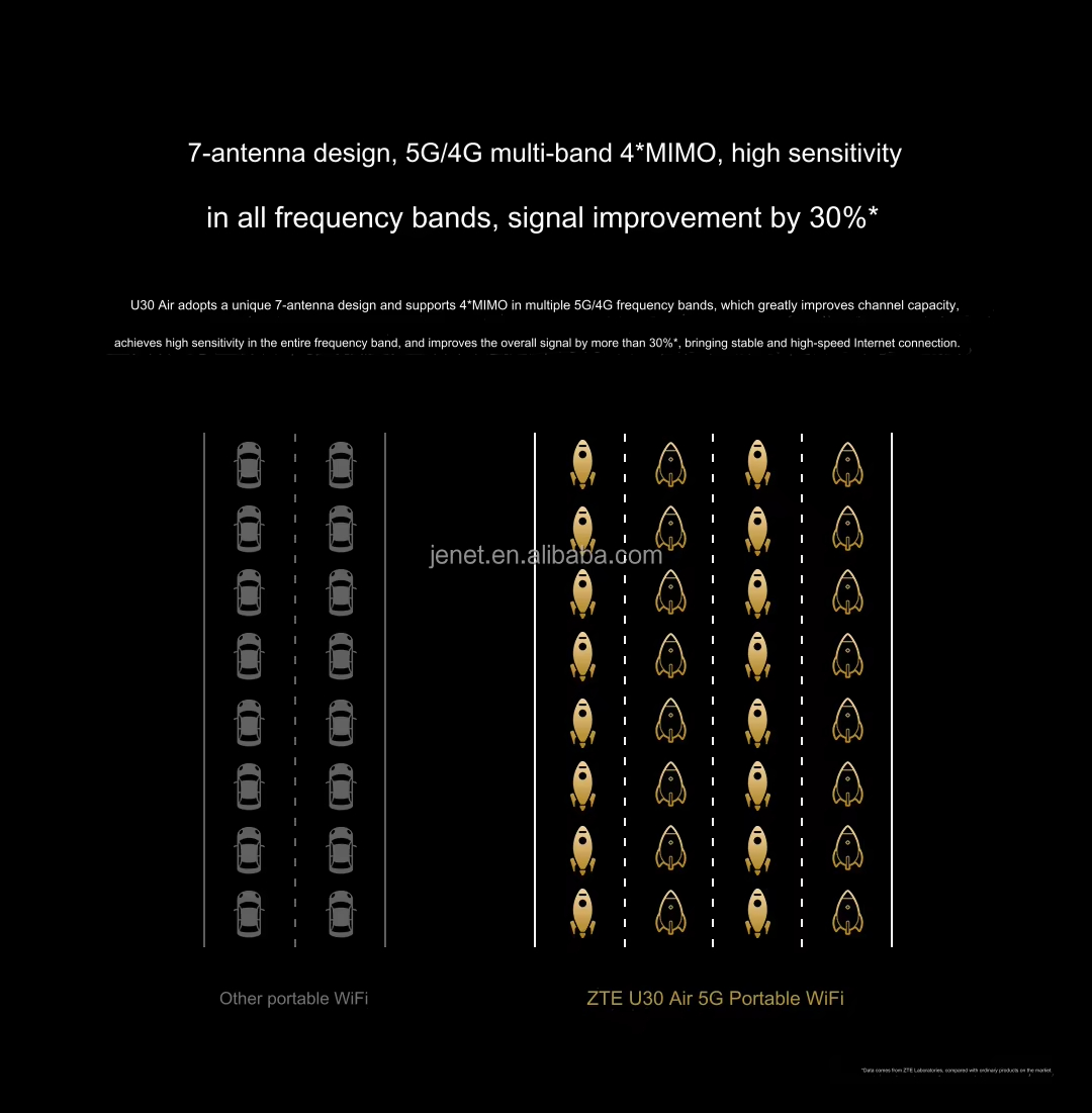 U30 Air is a new 5G 5G Pocket WiFi Router for wireless connection. It utilizes a design with 7 antennas, supporting multiple frequency bands for 5G/4G with 4x MI MO, increasing channel capacity and improving overall signal strength by 30%. The U30 Air also features dual SIM cards for 5G from both China Mobile and China Telecom, supporting AI network scheduling algorithms for intelligent switching, suitable for use in scenarios such as underground parking lots, elevators, subways, and high-speed trains.